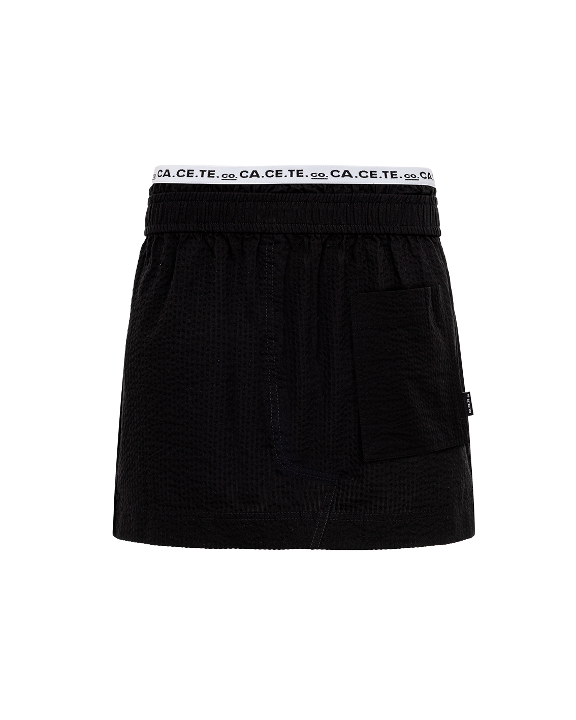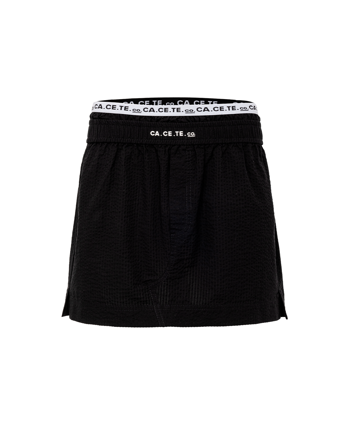 - Modelagem com caimento reto e cintura intermediária, lembrando o formato de uma minissaia boxer